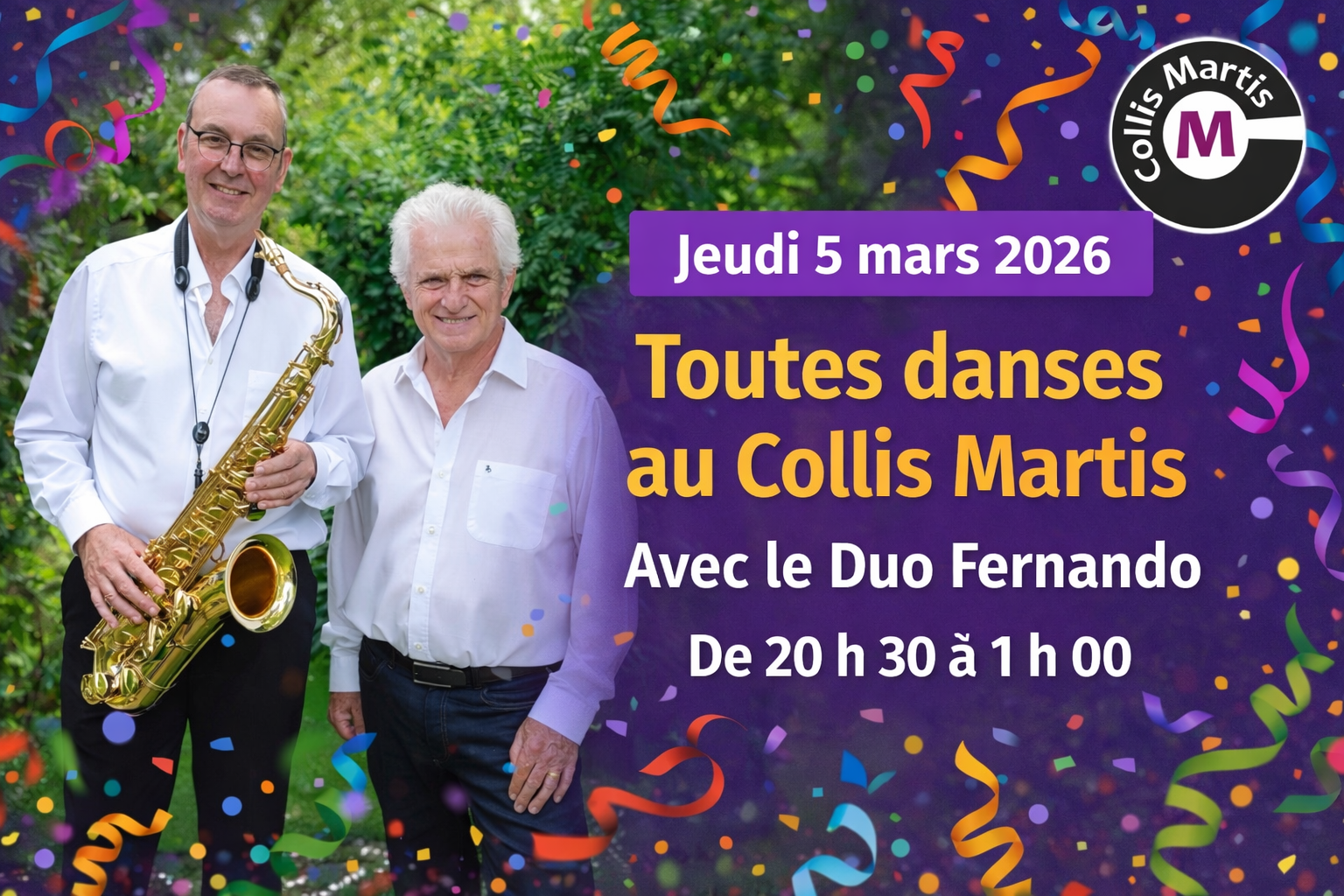 🎷✨ SOIRÉE TOUTES DANSES AU COLLIS MARTIS ✨🎶 📅 Jeudi 5 mars 2026 🕣 De 20 h 30 à 1 h 00 📍 Collis Martis Venez