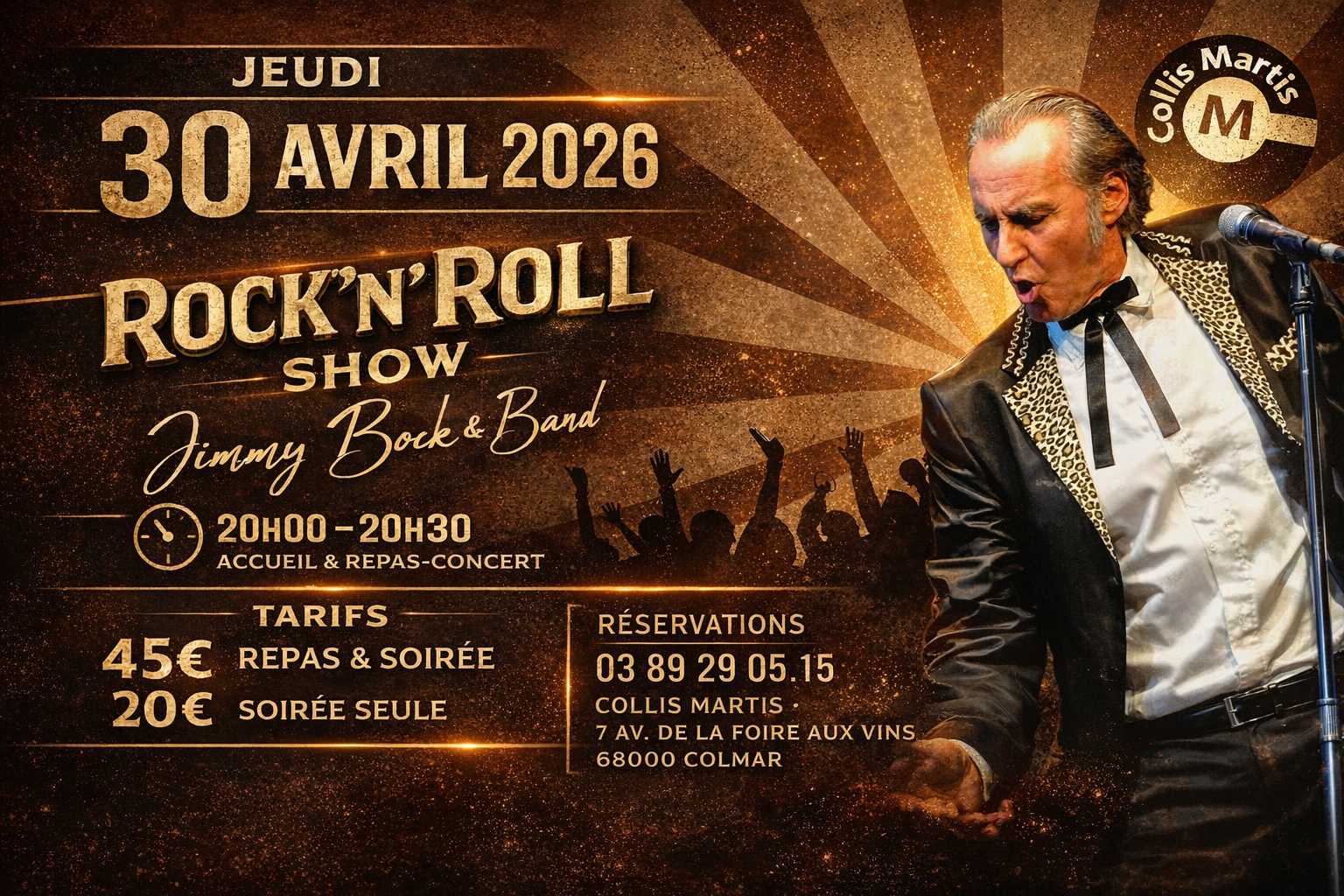 • Jeudi 30 avril 2026 : Rock’n’Roll Show par Jimmy Bock 45 € repas & soirée | 20 € soirée seule Le Collis Martis vous propose un Rock’n’Roll Show exceptionnel avec l’une