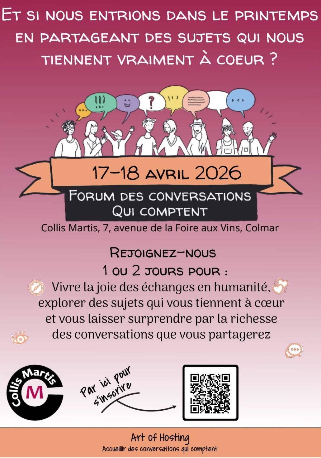 Le Forum des Conversations qui Comptent lance sa 1ère édition à Colmar, les 17 et 18 avril 2026 au Collis Martis. Et si nous entrions dans le printemps en partageant des